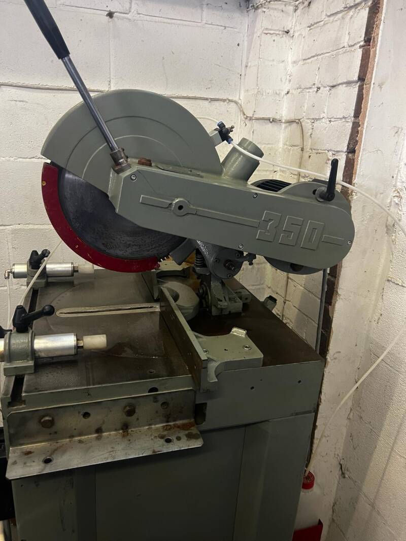Fully rebuilt. Air clamping. 350mm resharpened blade. Very heavy duty. Spray mist. Floor standing. Serviced and cleaned and refinished (can be connected to the Pertici Visual measuring system as shown elsewhere on the website).